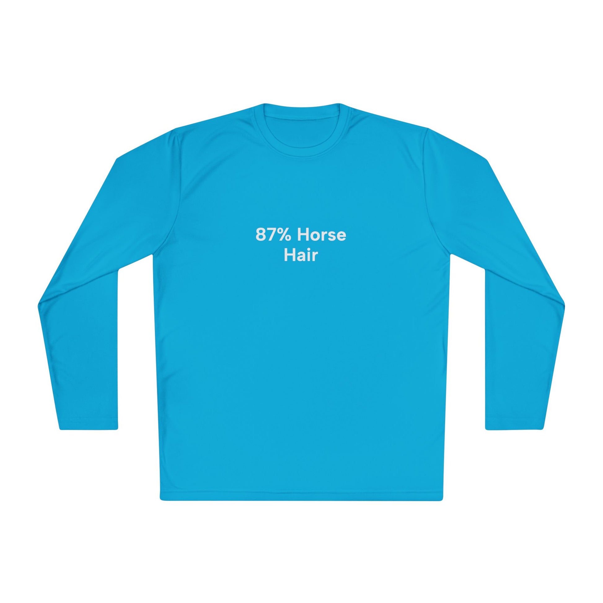 The 87% Horse Hair long sleeve tee is soft, flattering, trail-ride ready, and brutally honest about the reality of loving horses.