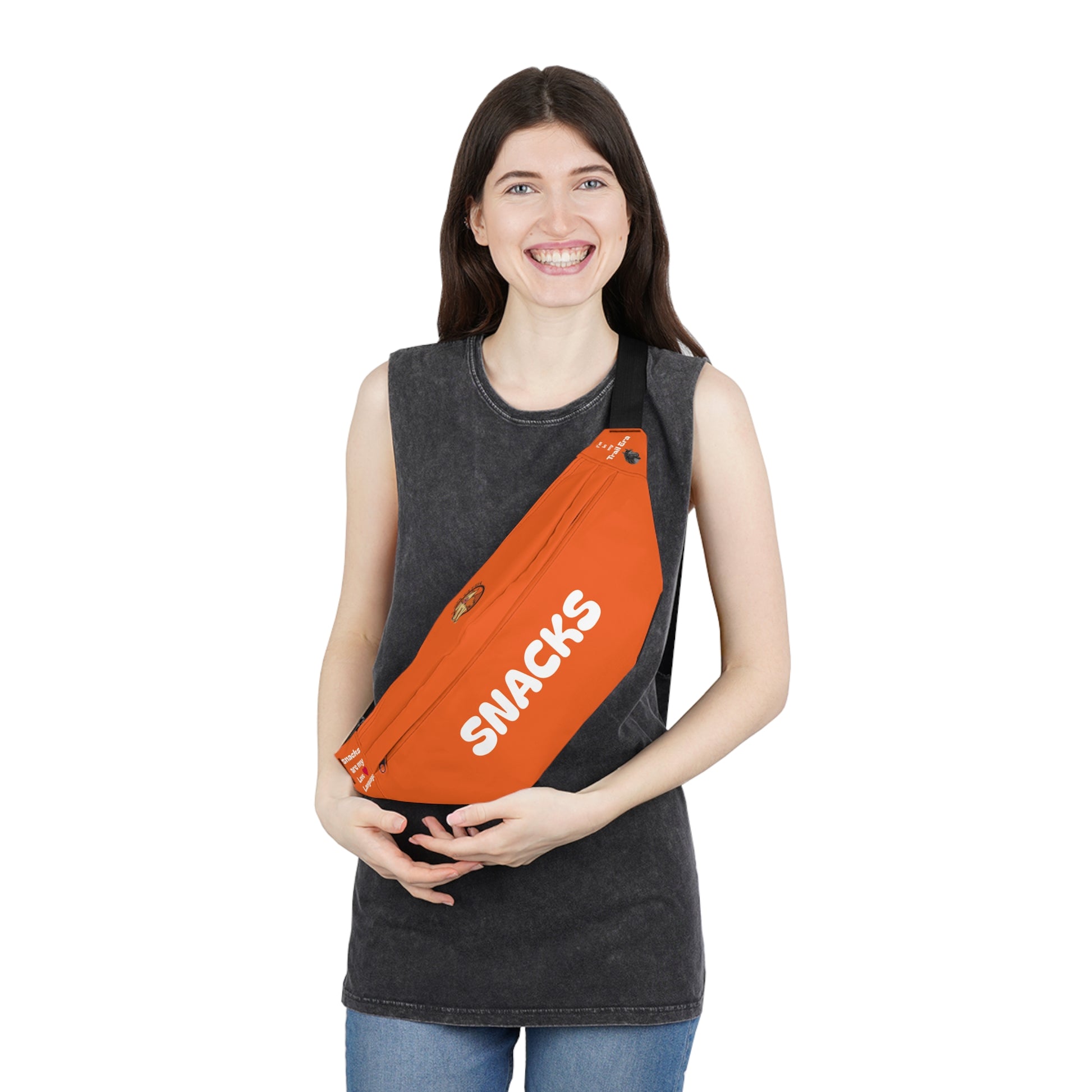 Inside? Organized like your life depends on it—multiple pockets so your phone, wallet, keys, and snacks all stay in their own lane. Outside? Loud, proud, and impossible to ignore with that punchy orange and unapologetic “SNACKS” front and center.
