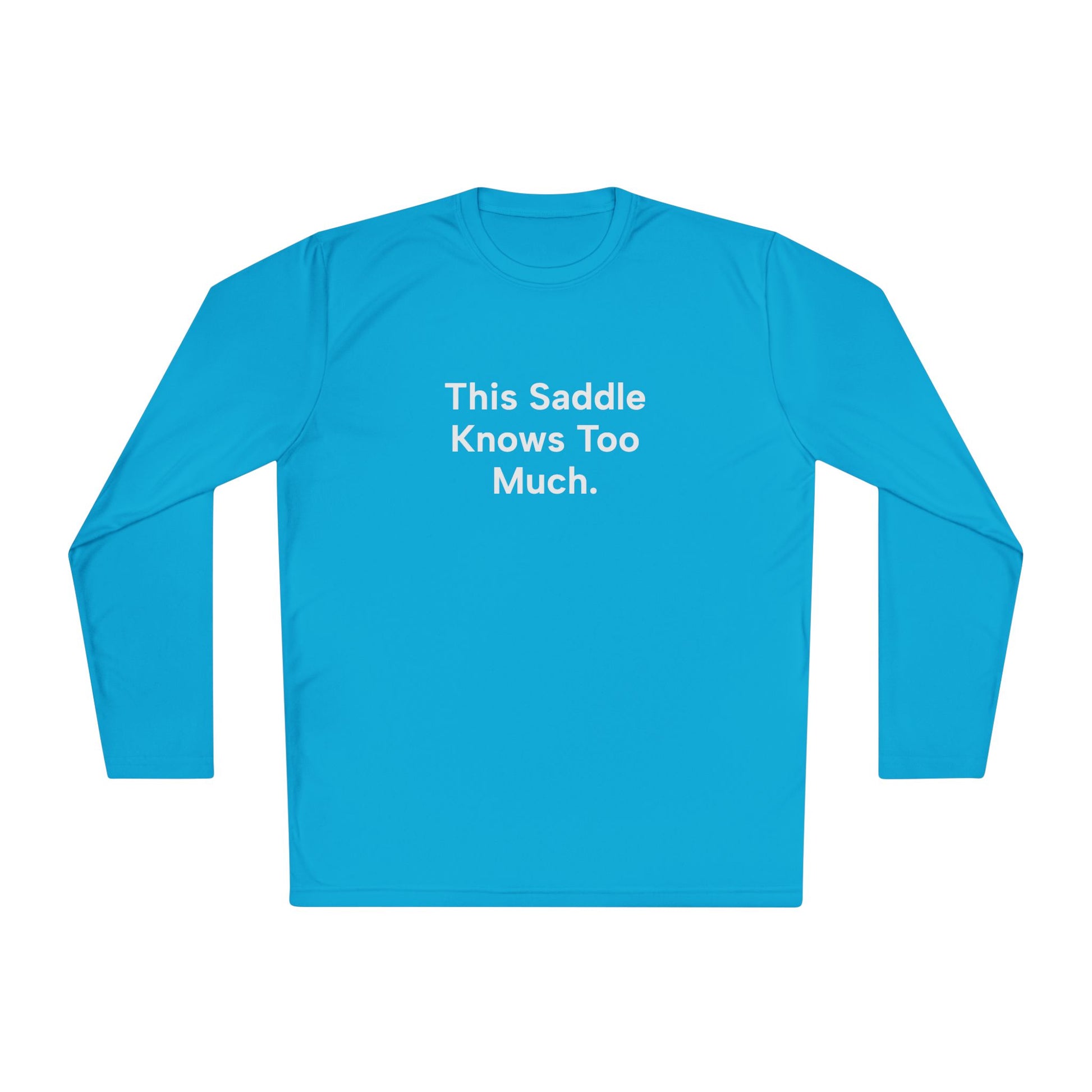 The “This Saddle Knows Too Much” tee is soft, flattering, and made for trail rides, barn days, and every moment your horse quietly saves you.
